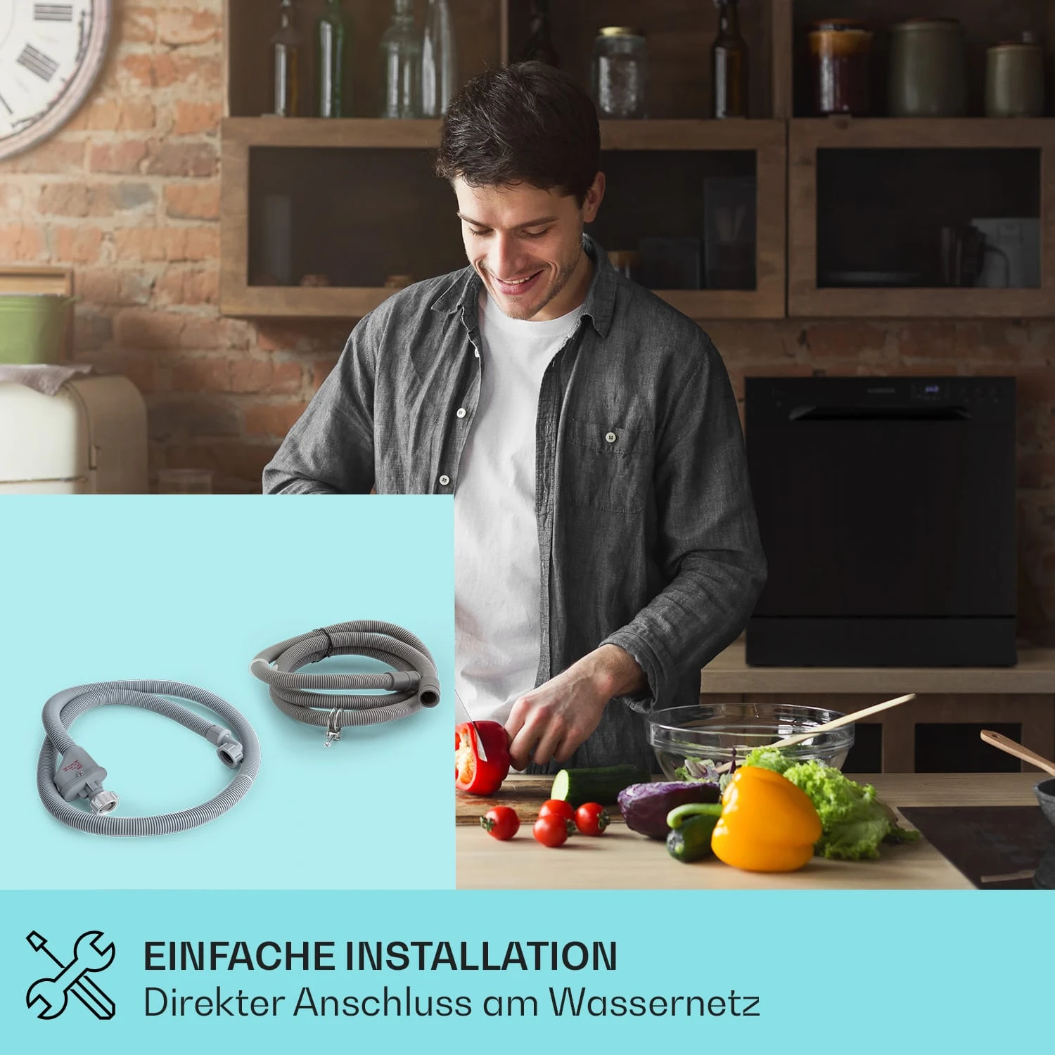 Glasklare Gläser und Geschirr: Der Klarstein Amazonia 8 Geschirrspüler spült zuverlässig im Kleinformat. Er hat ideale Maße für Single-Küchen, Ferienwohnungen oder Wochenendhäuschen! Fast unscheinbar durch seine Größe übernimmt er deinen Abwasch, dabei finden bis zu 8 Maßgedecke gleichzeitig Platz in der modernen Mini-Geschirrspülmaschine. Über das 3-Tasten-Bedienfeld kannst du aus 6 vorteilhaften Programmen wählen – so nimmt es die Amazonia 8 selbst mit starkem Schmutz auf, während sie in der Küche ein wahrer, designstarker Blickfang ist.