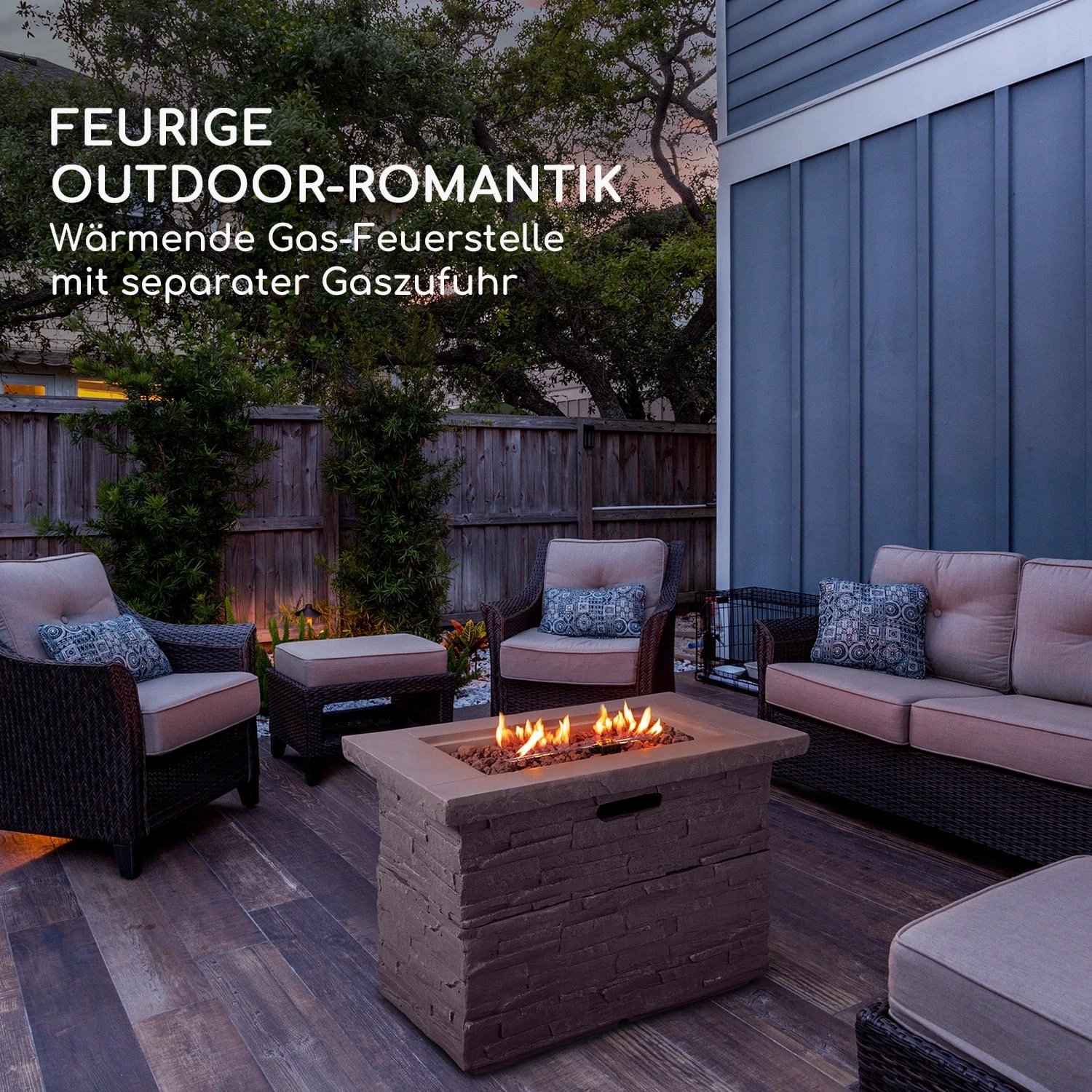Leistungsstarke Gas-Feuerstelle für Romantik und natürliche Wärme in Outdoor-Oasen: Die blumfeldt Anafi Gas-Feuerstelle verbindet rustikale Schönheit mit komfortabler Funktionalität.