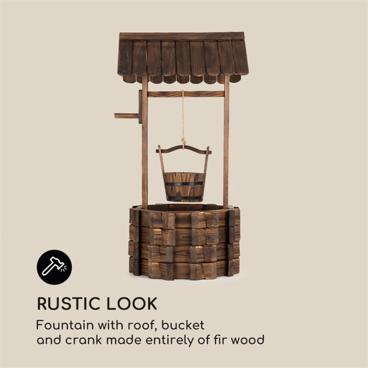Damit der Zierbrunnen lange seine schöne Gestalt bewahrt, wurde das Holz durch Flame Shielding Treatment einer aufwändigen Brandbehandlung unterzogen. Derartig geflammt ist es nicht nur der Witterung gewachsen: Der Brunnen erhält gleichzeitig zusätzliches Flair durch die künstlich gealterte Oberfläche – als hätte der Brunnen schon Jahrhunderte an seinem Platz überdauert.