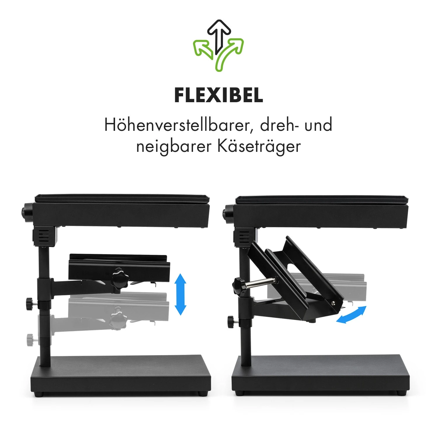 So genießt man Raclette auf traditionelle Art: Edel gereifter Käse, vom Block geschmolzen und auf Baguette, Kartoffeln oder Fleisch verteilt. Dazu wird der Käse direkt im Käseträger eingespannt und unter dem 1000 Watt starken Heizelement positioniert. Per Höhenverstellung bestimmt man unkompliziert, wie schnell der Käse eine cremige Konsistenz erlangt. Der Käseträger lässt sich zudem seitlich schwenken sowie horizontal kippen, um den Käse ganz einfach und komfortabel auf dem jeweiligen Teller zu verteilen. Natürlich kann die Heizleistung über den integrierten Thermostatschalter eingestellt werden: Wer den Käse lieber dunkler mag, stellt die Temperatur einfach höher ein.