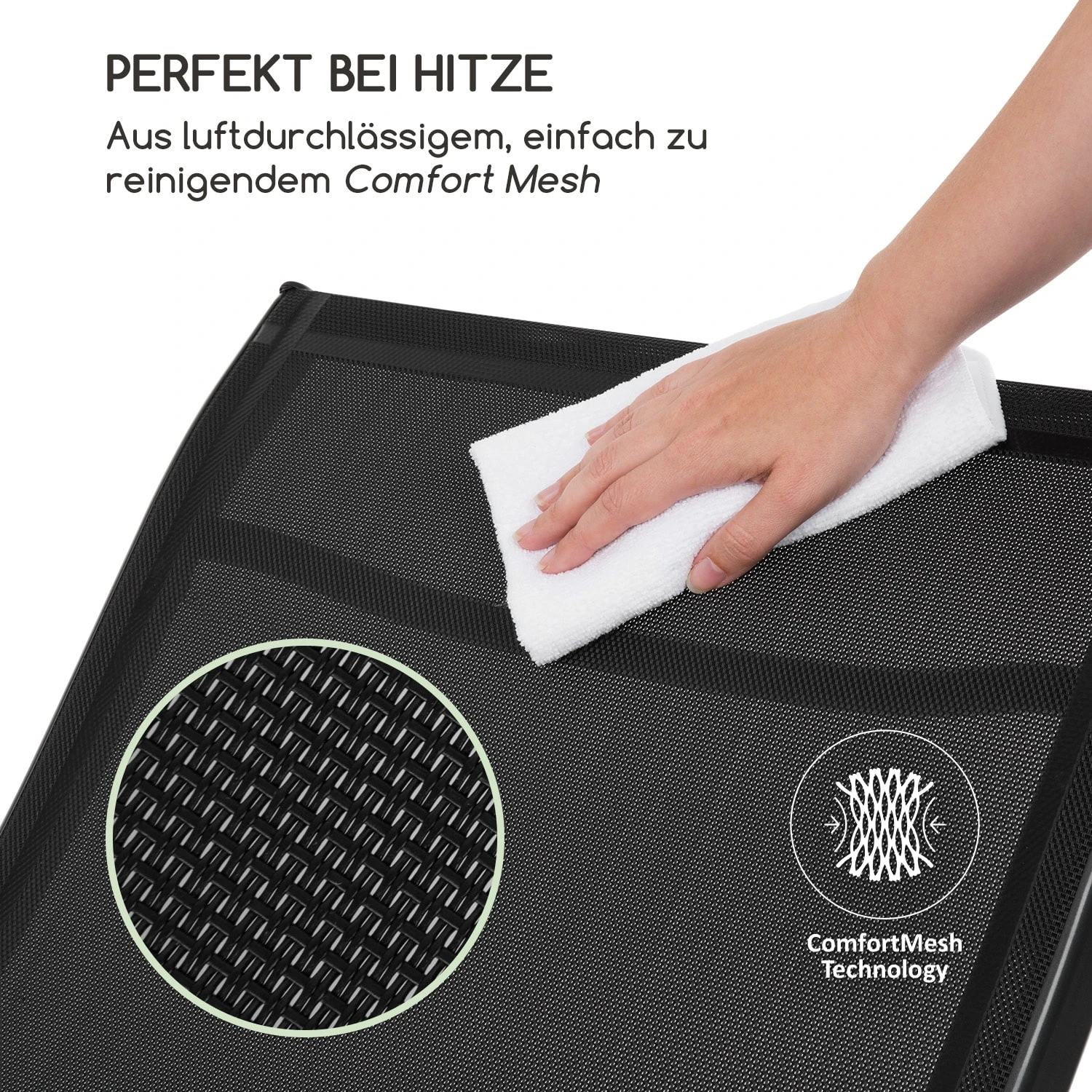 Die Sonnenliege bietet eine Entspannungsfläche aus luftdurchlässigem Comfort Mesh, das hervorragend für warme Sonnentage geeignet ist und sich durch die pflegeleichte Textilstruktur besonders einfach reinigen lässt. In vier Stufen bei einer Höhe von 51-90 cm passt sich die verstellbare Rückenlehne jederzeit mit wenigen Handgriffen den eigenen Bedürfnissen an.