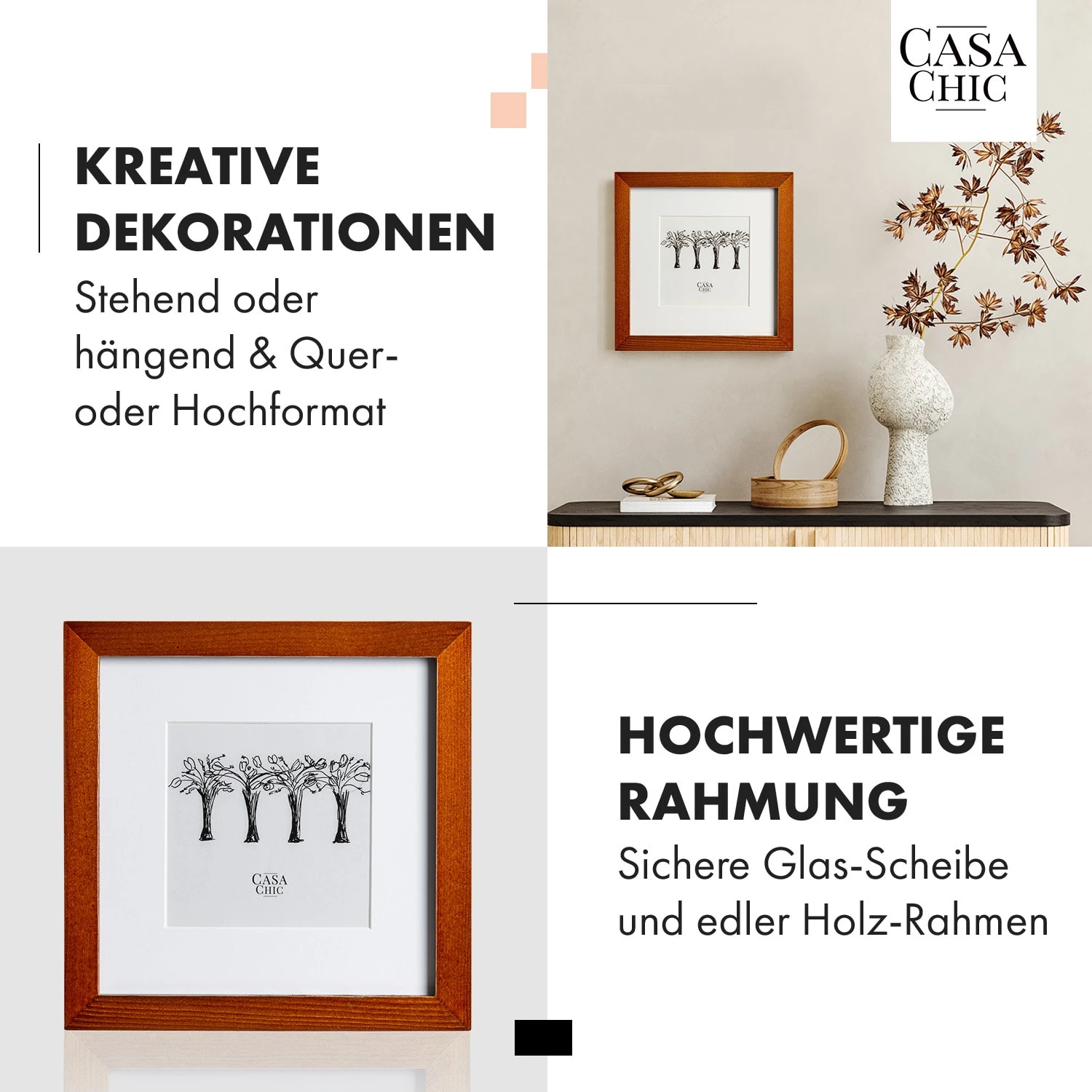Der exklusive Bilderrahmen Bristol von Casa Chic by blumfeldt gibt jedem Bild den perfekten Rahmen. Hier verbindet sich hochwertige Qualität aus Handarbeit mit besonders stilvollem Design. Hinter dem bruchfesten Sicherheitsglas finden Kunstobjekte, Drucke oder Fotografien optimalen Schutz vor Staub, Feuchtigkeit und Licht. Die Tiefe des Bristol Bilderrahmen hebt dabei deine Bilder in jedem Raum wundervoll hervor und das breite Rahmenprofil wird zum eleganten Kontrast. Der hochwertige Fotorahmen ist an der Rückseite mit einem Aufsteller und einer Aufhängung versehen. Ohne Passepartout ist er passend für das Bildformat 20 x 20 cm und hinter dem dazugehörigen Passepartout kannst du Fotos und Bilder mit einem Format von 12 x 12 cm kunstvoll präsentieren.
