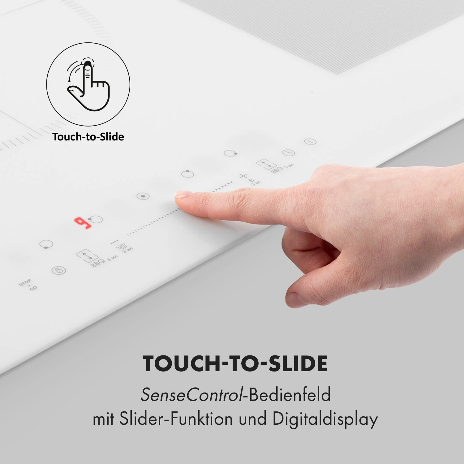 Fünf Kochflächen für den Genuss bietet das Klarstein Delicatessa 90 Flex Einbaukochfeld bei einer Gesamtleistung von max. 7400 W, die sich mit 1 x 2300, 2 x 2000 W und 2 x 1500 Watt auf die einzelnen Kochflächen verteilen und die Inhalte von Töpfen und Pfannen in Spitzenzeiten zum Kochen bringen. Dabei vereinen sich jeweils per VarioHeating die beiden linken bzw. rechten Kochzonen zu einer Flexzone: Mit maximaler Flexibilität passen die sich dank Topferkennung an die Größe der darauf gesetzten Töpfe, Pfannen oder Kasserollen an und erhitzen so auch großes Kochgeschirr, das nicht auf ein einzelnes Kochfeld passt. Damit verbraucht die Delicatessa 90 Flex zum einen wirklich nur die Energie, die für den Topf passend ist und ermöglicht zum anderen die Nutzung fast jeder Topf- oder Pfannengröße. Alle Einzelfelder sowie die Flexfeld lassen sich separat in ihrer Leistung regeln und verfügen über eine ThermoBoost-Funktion, mit der die Leistung zum schnellen Erhitzen nochmals auf bis zu 3000 W gesteigert wird. Bedient wird das Klarstein Delicatessa 90 Flex Glaskeramik-Kochfeld unkompliziert mit einem integrierten SenseControl Touch-Panel mit Touch-to-slide-Regler zur Leistungskontrolle und Digitaldisplay. So durchbrechen weder Knöpfe noch Regler die Oberfläche der Küchenzeile. Neben der Leistung kann für jedes Kochfeld ein bis zu 99-minütiger Timer programmiert werden, der entweder nach Ablauf der eingestellten Zeit die Kochplatte abschaltet oder ein akustisches Signal ertönen lässt.
