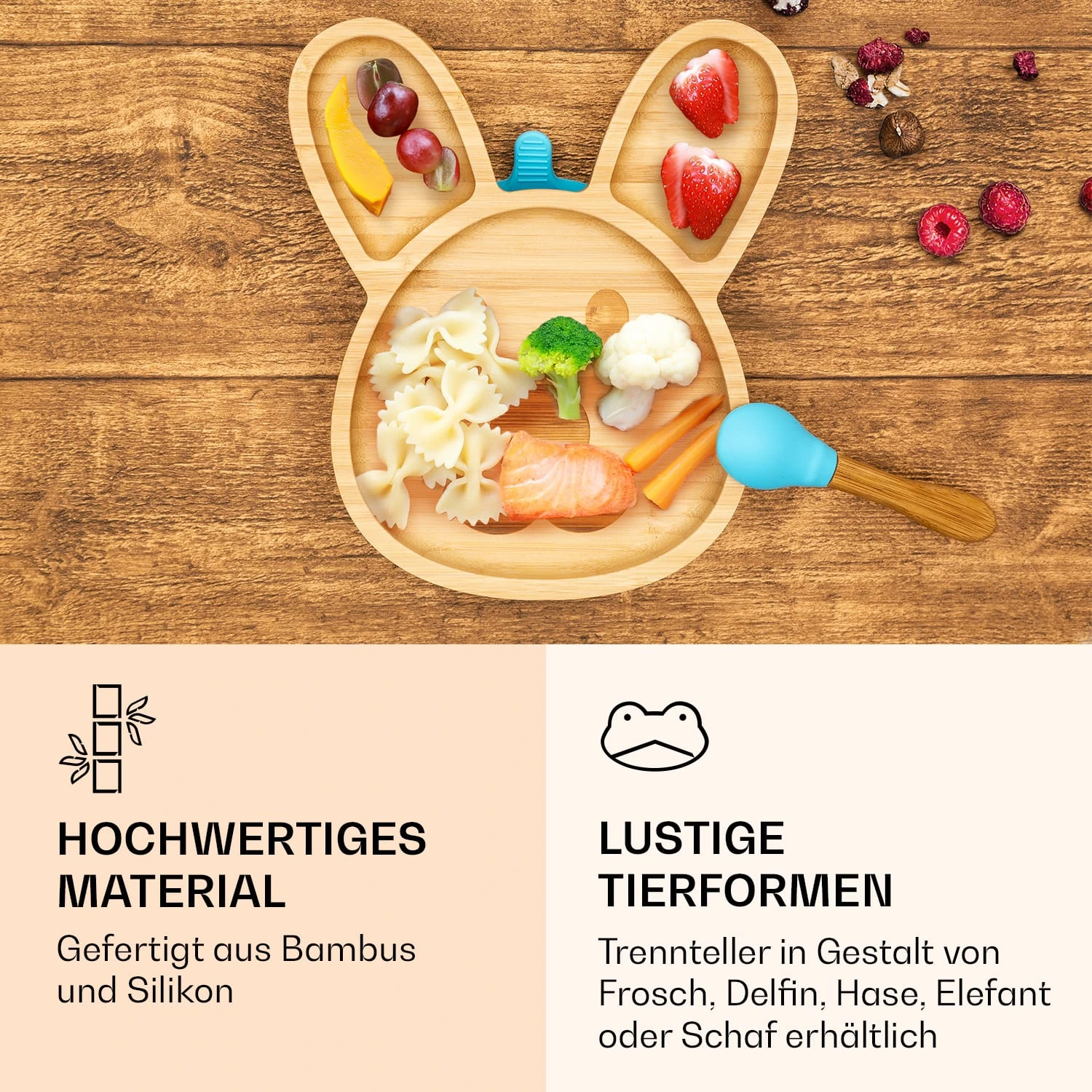 Spiel und Spaß beim Essen! Das Kindergeschirr mit Bambusteller und Löffel von Klarstein ist nahezu unverwüstlich! Dafür sorgen das robuste Bambus-Material und der Silikon-Saugnapf, der den Essteller am Tisch befestigt. Besonders viel Freude bei den kleinen Gourmets bereiten aber die lustigen Tierformen des Tellers: Mit Frosch, Hase, Schaf, Elefant oder Delfin isst es sich gleich viel interessanter! Alle Trennteller sind aus Bambus gefertigt und enthalten keine Chemikalien oder Schadstoffe. Qualitätskontrollen versichern außerdem, dass sie keinen Eigengeruch oder Eigengeschmack an die Nahrung abgeben. Du kannst sie somit jederzeit mit heißen wie kalten, festen wie flüssigen Lebensmitteln befüllen. Das motivierende Lernbesteck – bestehend aus einem Teller und einem farblich passenden Löffel – ist eine tolle Geschenkidee für frisch gebackene Eltern und ihren kleinen Nachwuchs.