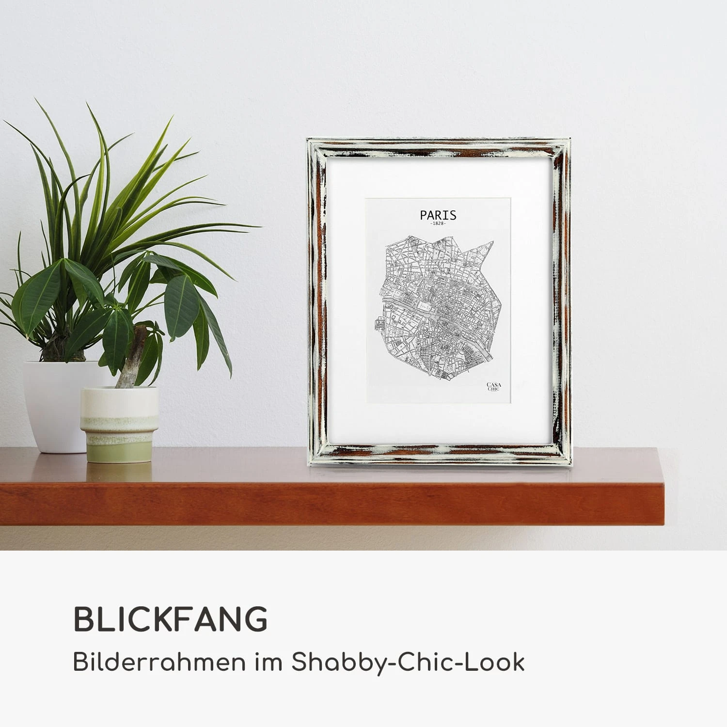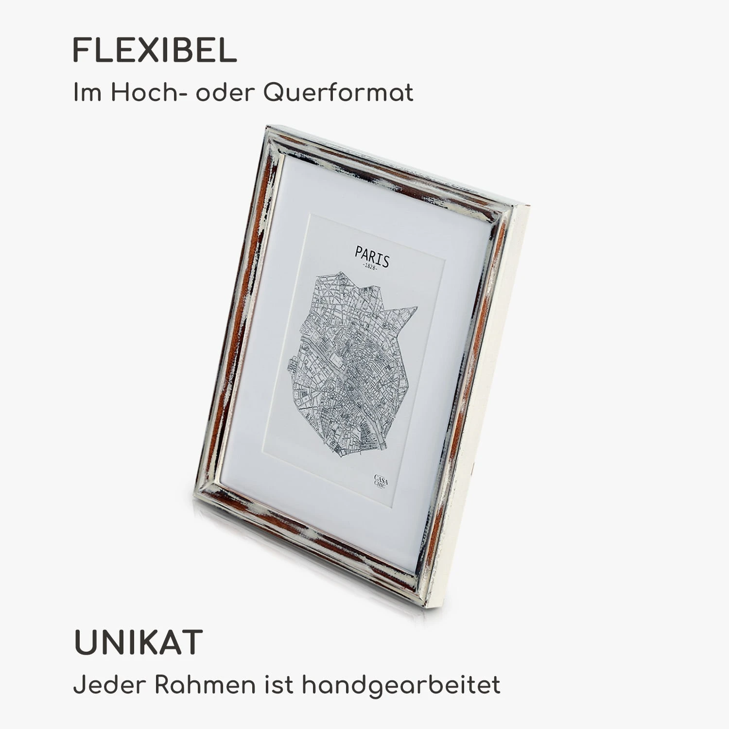 Jeder Rahmen ist ein Unikat: Der Lancaster Bilderrahmen von Casa Chic by blumfeldt aus edlem Pinienholz im Shabby-Chic-Look ist handgearbeitet und bringt deine Fotos und Bilder sowohl im Hoch- als auch im Querformat ideal zur Geltung. Bleibe flexibel und gestalte wunderschöne Wandcollagen oder arrangiere deine Lieblingsfotos auf dem Sideboard oder im Regal. Das mitgelieferte Passepartout überlässt dir die Wahl des passenden Bildausschnitts. Das gleichmäßig breite Rahmenprofil und die Frontscheibe aus Echtglas sorgen für Eleganz und besten Schutz.
