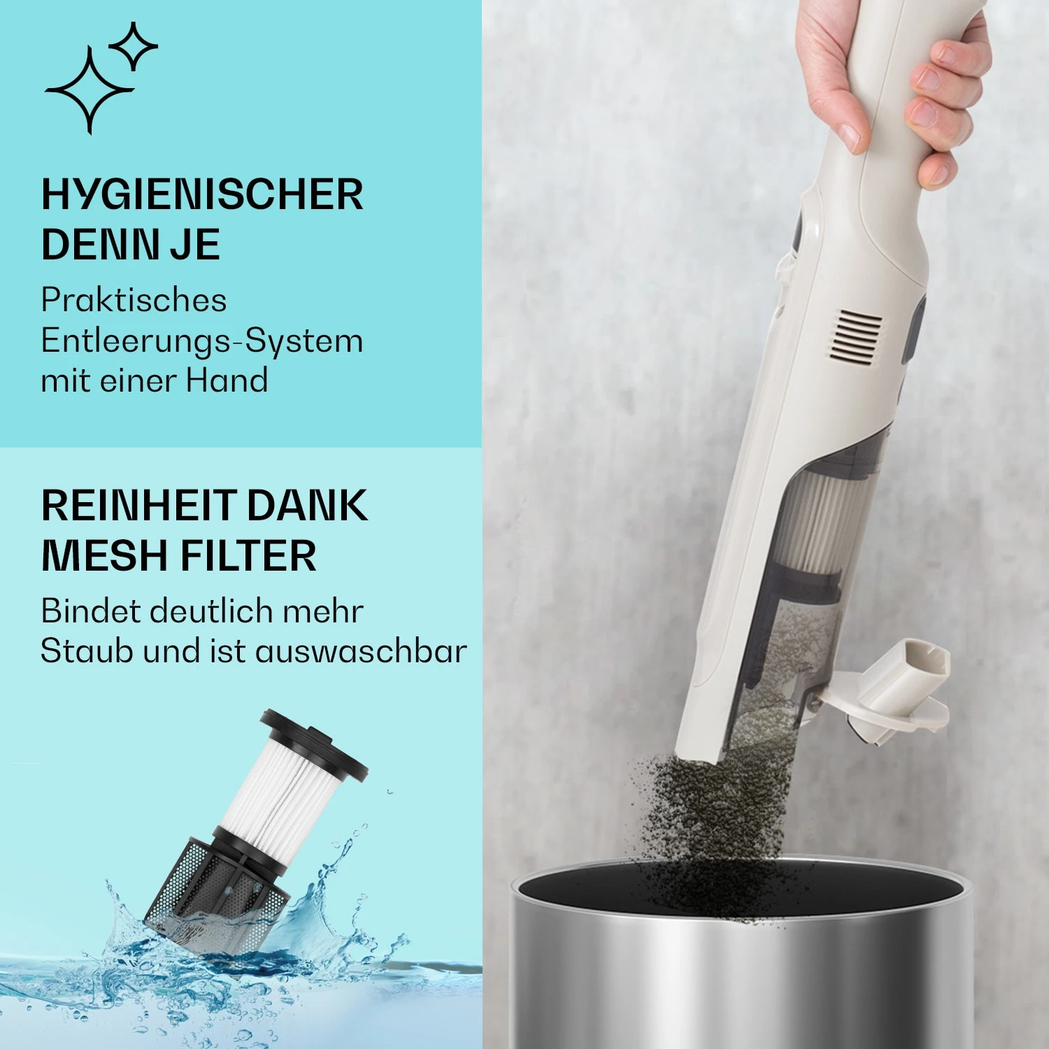 Kompakt, beutellos und kraftvoll: Der Klarstein LARMA Akku-Handstaubsauger macht mit Staub, Haaren und Schmutz kurzen Prozess. Seine handliche Größe ist perfekt zum Reinigung von Sofas, Polstern und Autos geeignet. Dabei befördert der starke Motor des LARMA bis zu 32 Minuten lang unaufhörlich Haare, Krümel und Fusseln in den mit einem EPA E10-Filter bestückten Staubbehälter. Die 2-in-1 Fugendüse mit Möbelbürste sowie eine Polsterdüse kommen an unzugängliche Stellen während die USB-C-Ladestation ein besonders bequemes Ladeerlebnis ermöglicht.