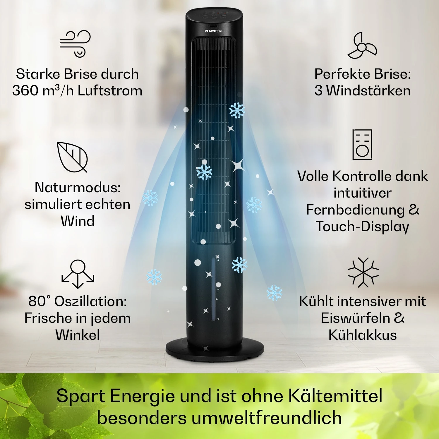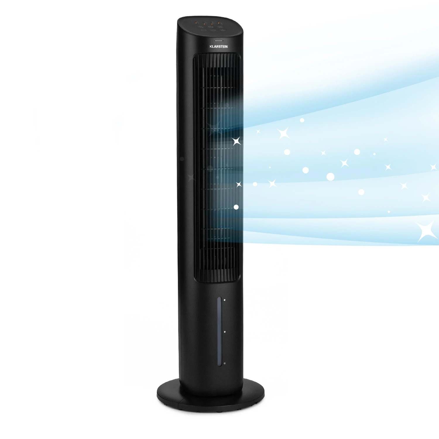 Drei Windstärken und drei Betriebsmodi sorgen für abwechslungsreiche, punktgenaue Erfrischung als Ventilator. Die zuschaltbare 80°-Oszillation fächert auch mehr als einer Person Frischluft zu. Kommt dann noch der Luftkühler zum Einsatz, ist bei jeder Tätigkeit Abkühlung angesagt. Zwei austauschbare Kühlakkus für den Wassertank können diesen Effekt nochmals verstärken. Damit nicht genug, bringt er im Winter als Luftbefeuchter Erleichterung bei trockener Luft und beseitigt als Ionisator Schmutzpartikel und Gerüche. Die Steuerung erfolgt via Touch-Bedienfeld oder bequem per Fernbedienung.