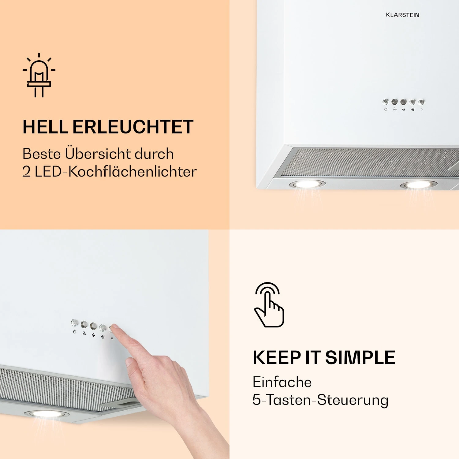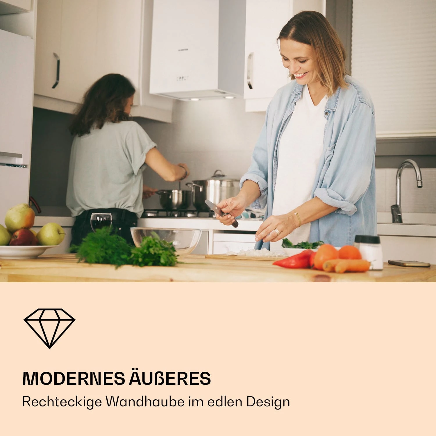 Die Monumenta Dunstabzugshaube von Klarstein überzeugt mit ihrer einfachen Bedienung, starken Leistungswerten und einem eleganten, eckigen Design. Durch ihren Luftdurchsatz von bis zu 559 m³/h sorgt die Wandabzugshaube für klare Luft in jeder Küche und lässt Dunst und starken Gerüchen keine Chance. Die zwei integrierten LEDs leuchten dein Kochgeschehen taghell aus. Gesteuert werden alle Funktionen ganz bequem über ein frontseitiges 5-Tasten-Bedienfeld. Hochwertige Materialien und das moderne Design vereinen sich zu einem echten Blickfang. Mit drei Leistungsstufen, einem niedrigen Betriebsgeräusch von 68 dB und Energieeffizienzklasse B bereichtert die Klarstein Monumenta dein gesamtes Küchenambiente.