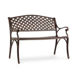 Mit ihrer schmiedeeiserenen Optik besitzt die Gartenbank den Charme längst vergangener Zeiten und bezaubert durch ihre filigrane Eleganz. Komplett aus Aluminiumguss gefertigt hält sie allen Witterungsbedingungen stand und lässt sich aufgrund der glatten Oberflächen wunderbar einfach reinigen. Mit ihrer knapp einen Meter breiten Sitzfläche bietet sie genug Platz für zwei Personen, die es sich zum Entspannen besonders bequem machen können. Wer es noch komfortabler haben möchte, kann eines der optional erhältlichen und passgenauen Sitzkissen verwenden.
