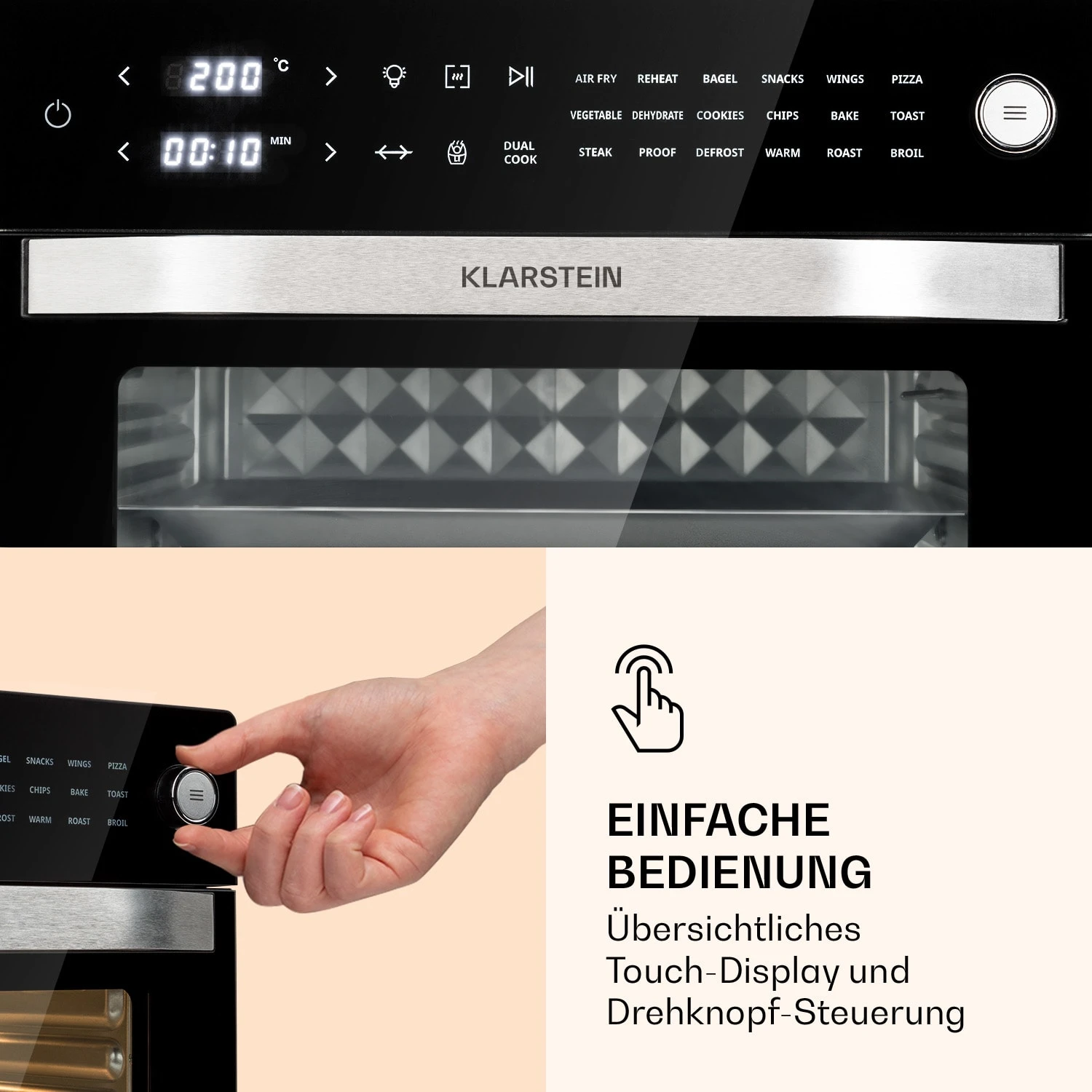 - 18 wählbare Programme sowie manuelle Garzeit- und Temperatureinstellung